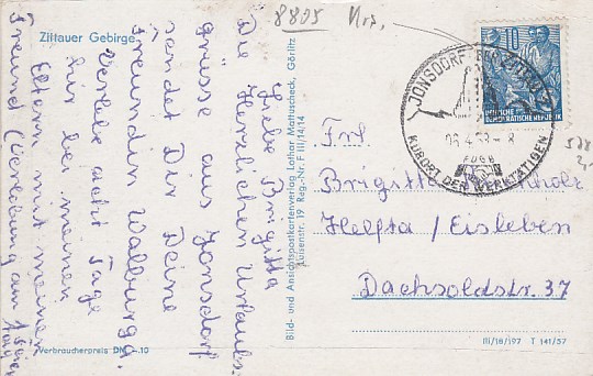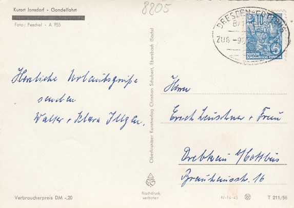 Kurort Jonsdorf in Sachsen Bahnpoststempel Dresden-Cottbus 1956
