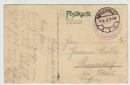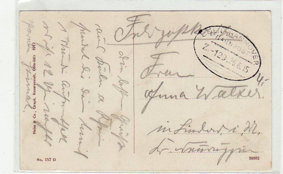 Bahnpoststempel Köln-Hannover auf Ansichtskarte Köln 1915
