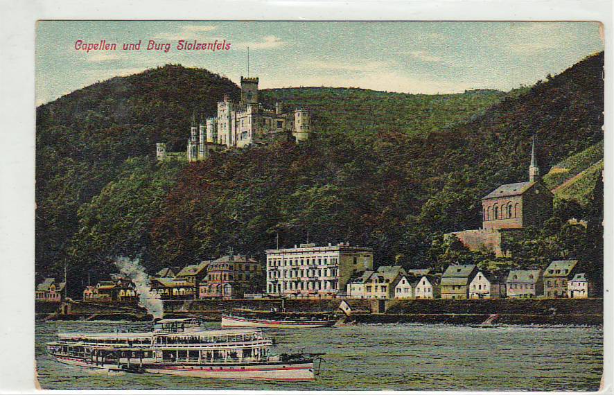 Bahnpoststempel Köln-Frankfurt am Main auf Ansichtskarte Capellen Burg Stolzenfels 1912