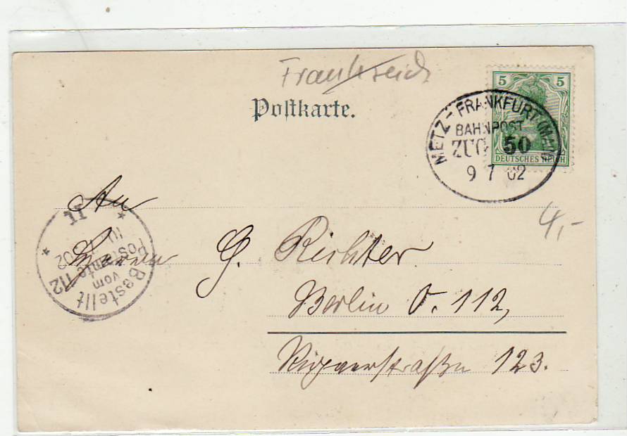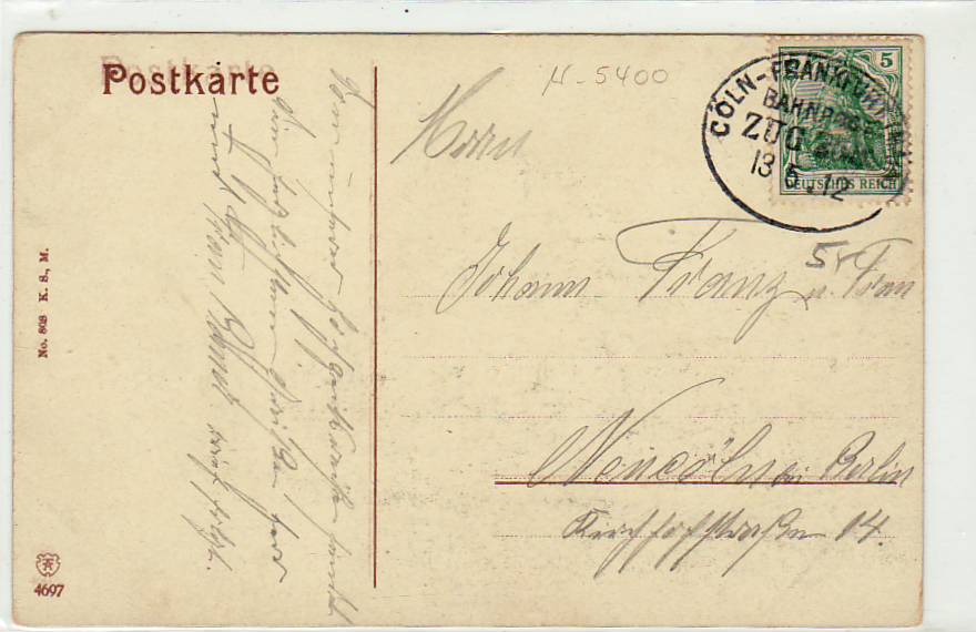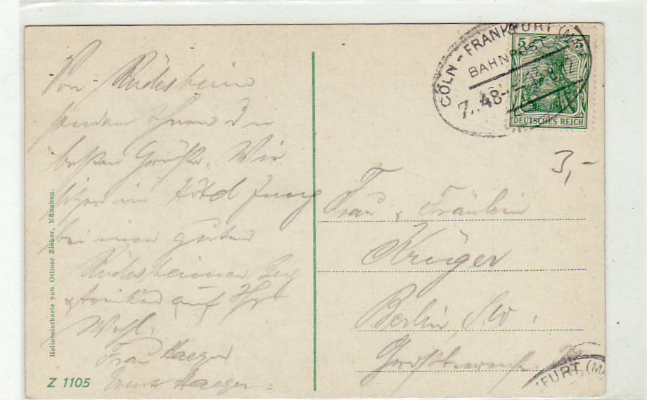 Bahnpoststempel Köln-Frankfurt am Main auf Ansichtskarte Rüdesheim 1912