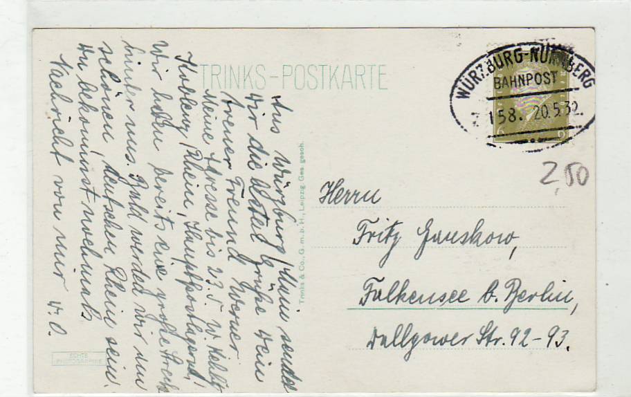 Bahnpoststempel Würzburg-Nürnberg auf Ansichtskarte Würzburg 1932
