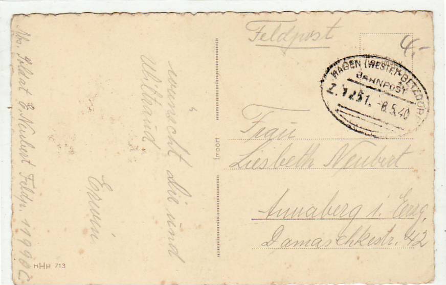 Bahnpoststempel Hagen-Betzdorf auf Ansichtskarte Glückwunsch Pfingsten 1940