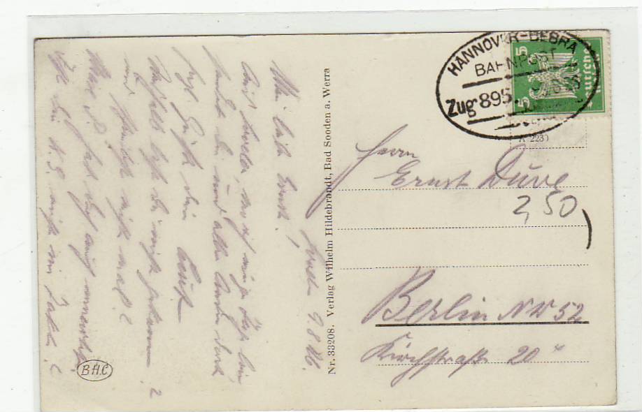 Bahnpoststempel Hannover-Bebra auf Ansichtskarte Bad Soden-Allendorf
