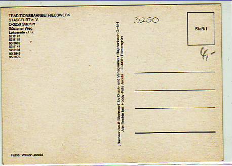 59771 [3250o167] |  | Stassfurt,Staßfurt Eisenbahn-Werk Dampflok ca 1990 | 4.00EUR 2.00EUR | In den Warenkorb |