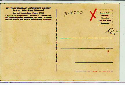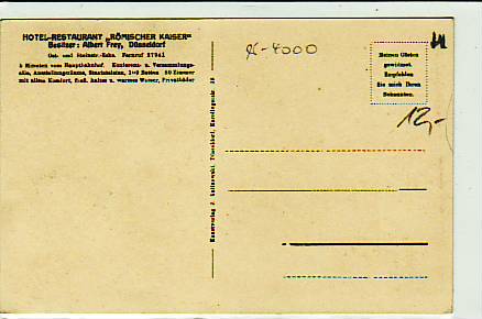 63619 [4000w590] |  | Düsseldorf Restaurant Römischer Kaiser ca 1930 | 13.00EUR 9.75EUR | In den Warenkorb |