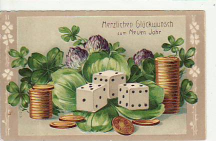 63648 [m42082] |  | Glücksspiel Glückwunsch neujahr Prägekarte Würfeln Münzen 1912 Stilleben | 9.00EUR 6.75EUR | In den Warenkorb |