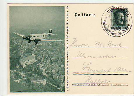 63696 [m65448] |  | Privat-Ganzsache Propaganda Nürnberg 1937 Lufthansa Flugzeug | 9.00EUR 6.75EUR | In den Warenkorb |
