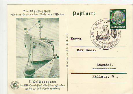 63689 [m65466] |  | Privat-Ganzsache KDF Robert Ley Stempel Hamburg 1939 | 11.00EUR 8.25EUR | In den Warenkorb |