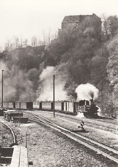 Eisenbahn Dampflokomotive Schmalspurbahn vor Wolkenstein