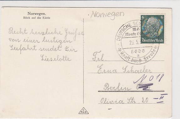Norwegen Deutsche Schiffspost KDF Monte Olivia 1937