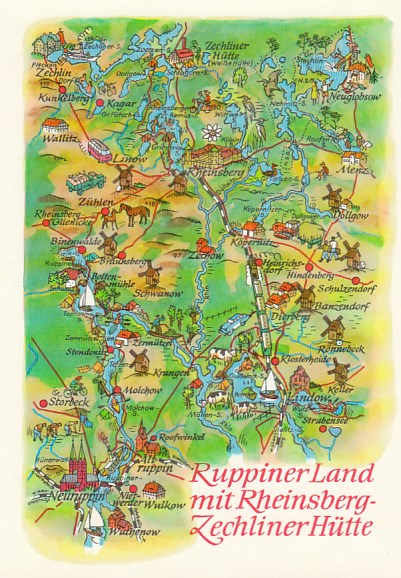 Postkarte als Landkarte Rheinsberg Flecken Zechlin Kagar Neuruppin Lindow