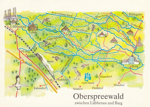 Postkarte als Landkarte Lübben Lübbenau Leipe Lehde Burg Stradow Kahnsdorf Müschen Spreewald
