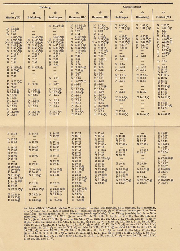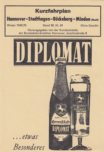 Eisenbahn Fahrplan Hannover-Stadthagen-Bückeburg-Minden Werbung Bier Diplomat