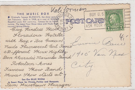 San Francisco California USA old postcard Popular Priced Musical Restaurant ca 1910