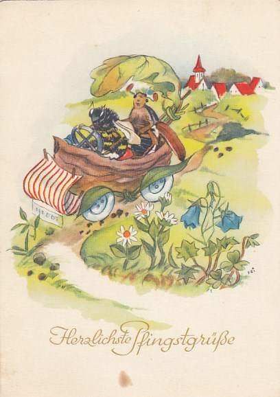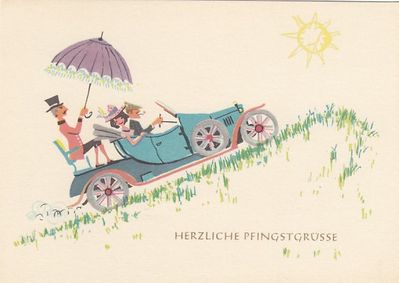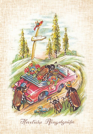 Glückwunsch AK Fröhliche Pfingsten Ansichtskarte Maikäfer Auto