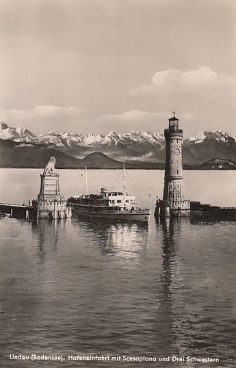 Lindau am Bodensee Leuchtturm und Motorschiff ca 1950