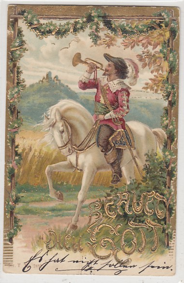 alte Künstlerkarten Pferde Reiter Gold Prägekarte 1905