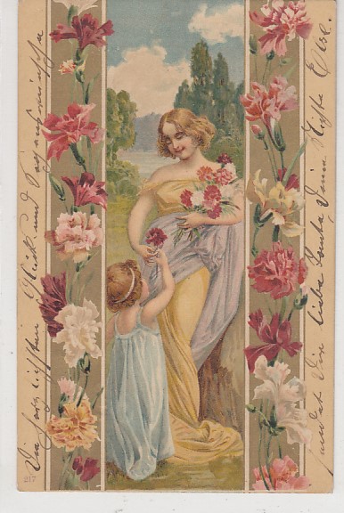 alte Künstlerkarten Frauen Kinder Blumen 1901