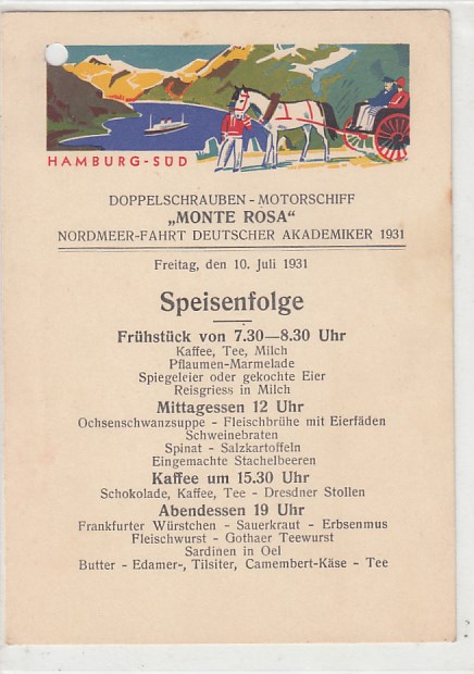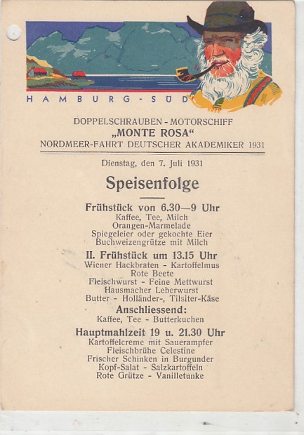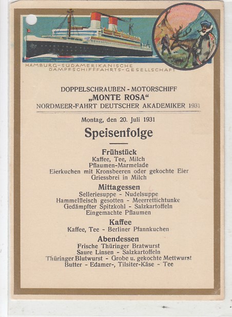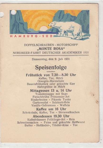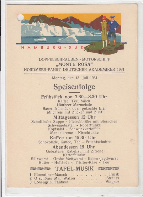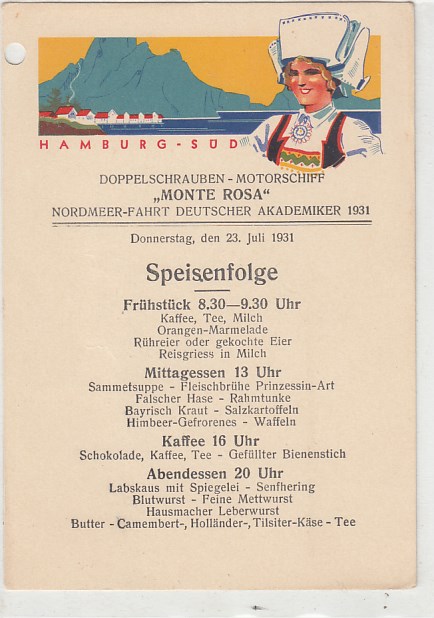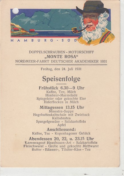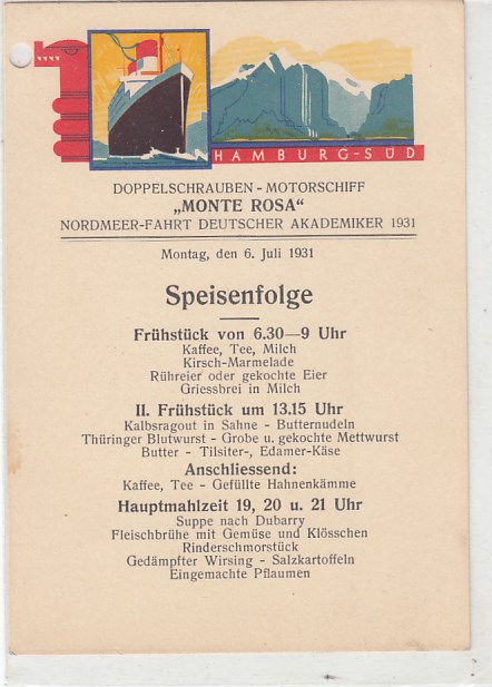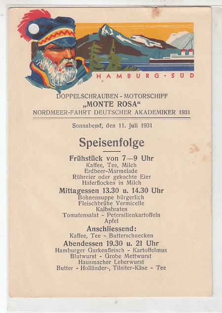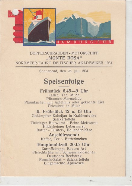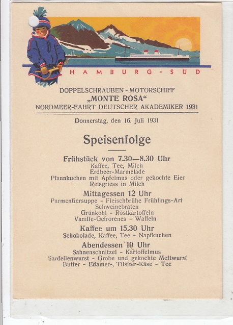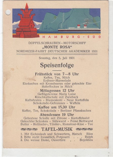 Menükarte Speisekarte Ozeandampfer Monte Rosa Linie Nordmeer-Fahrt 1931
