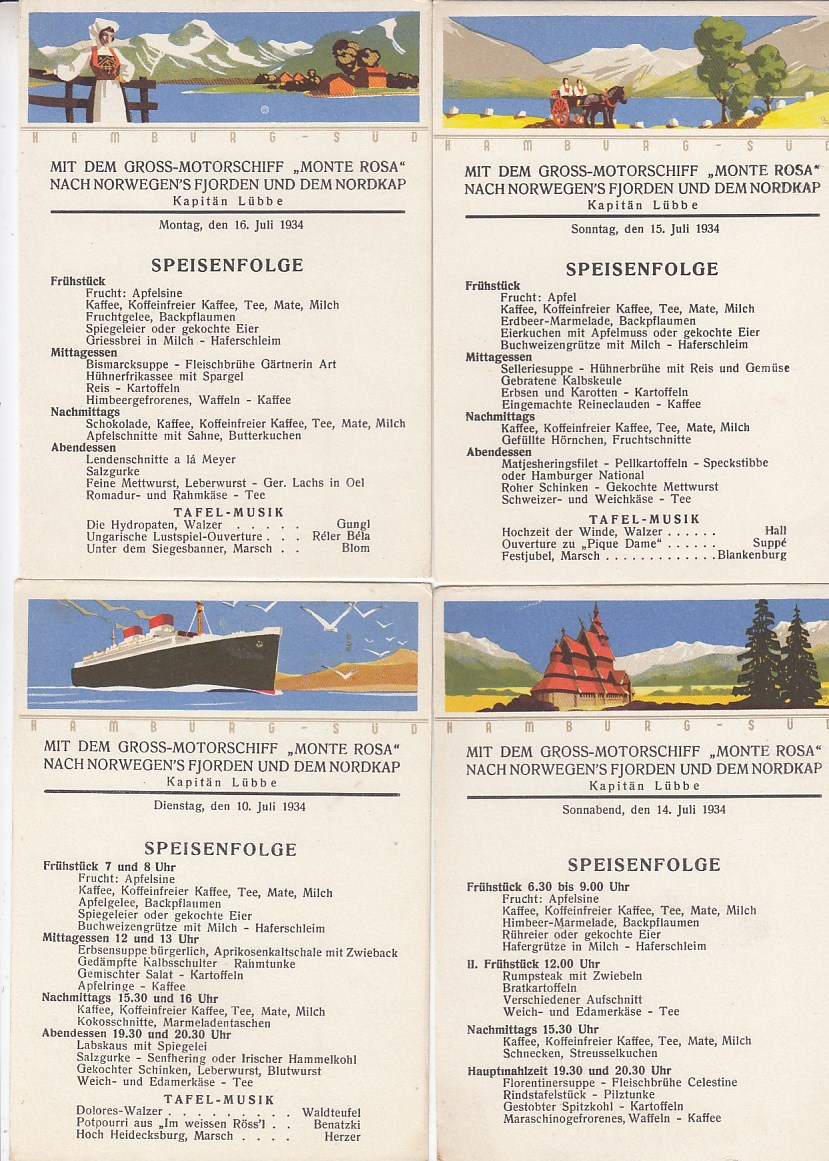Menükarte Speisekarte 4x Ozeandampfer Monte Rosa Norwegen Fjord und Nordkap 1934