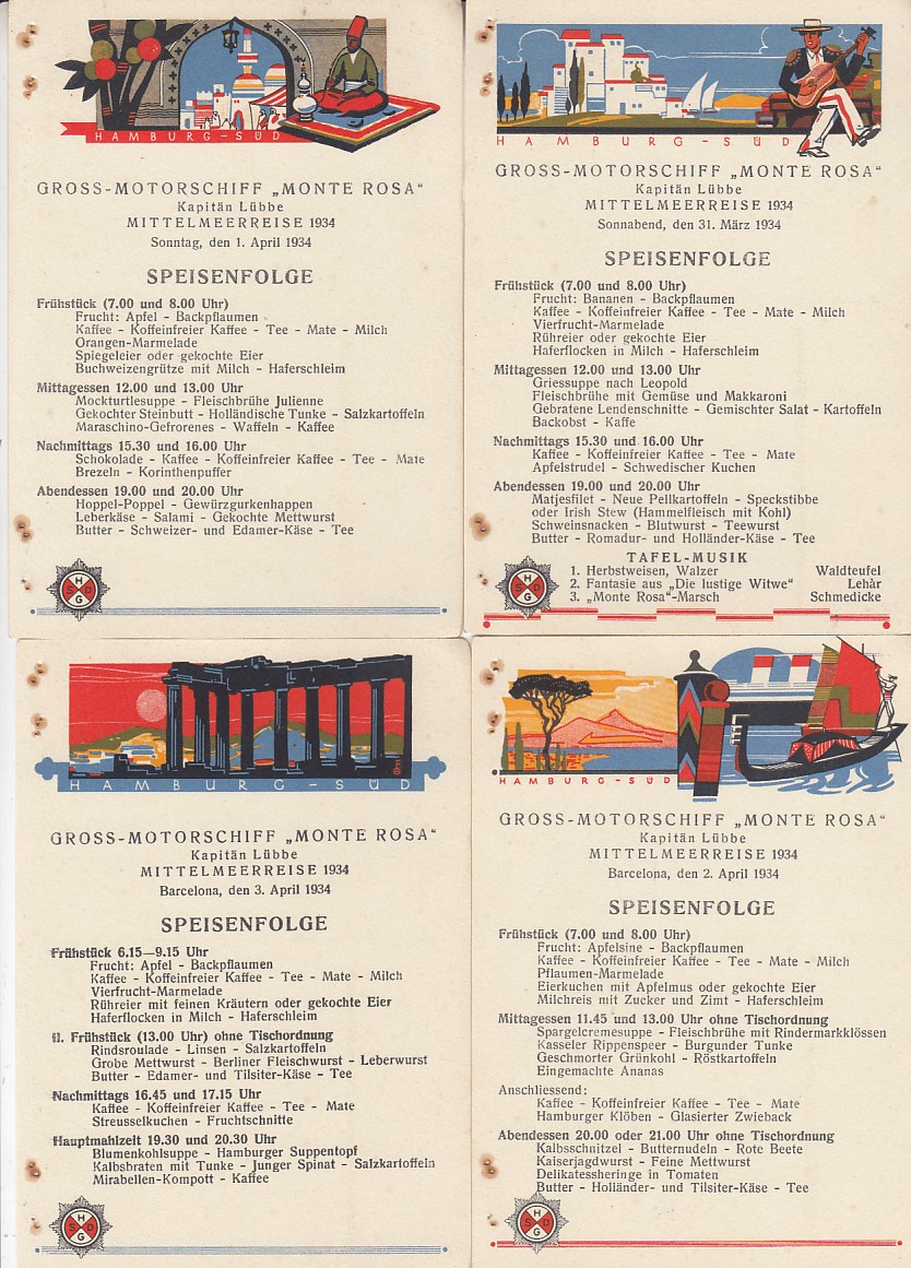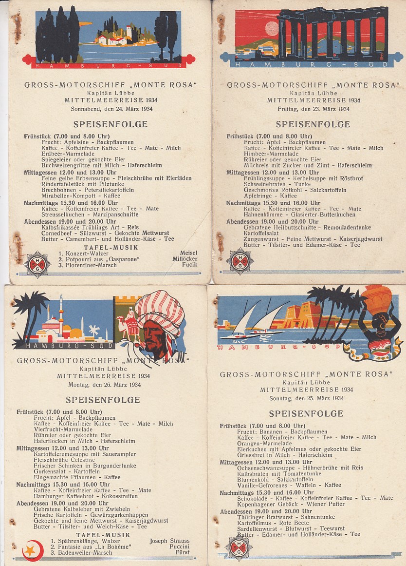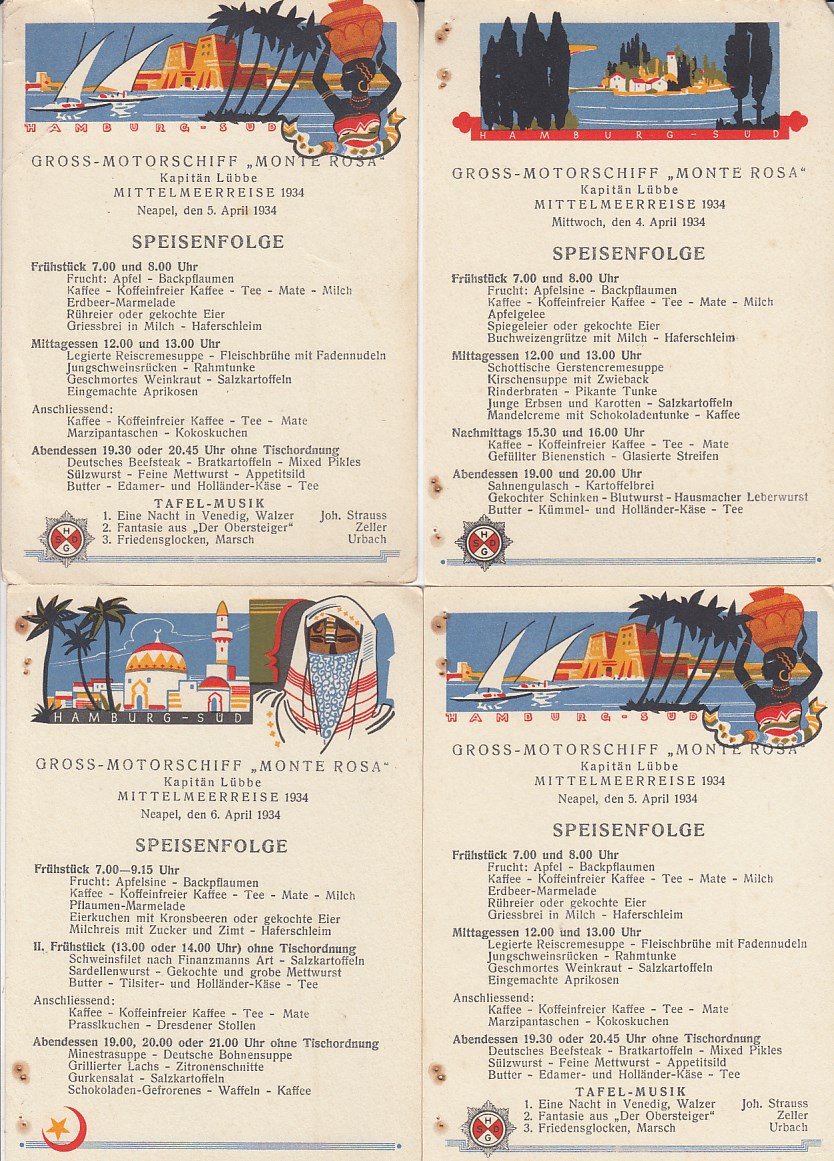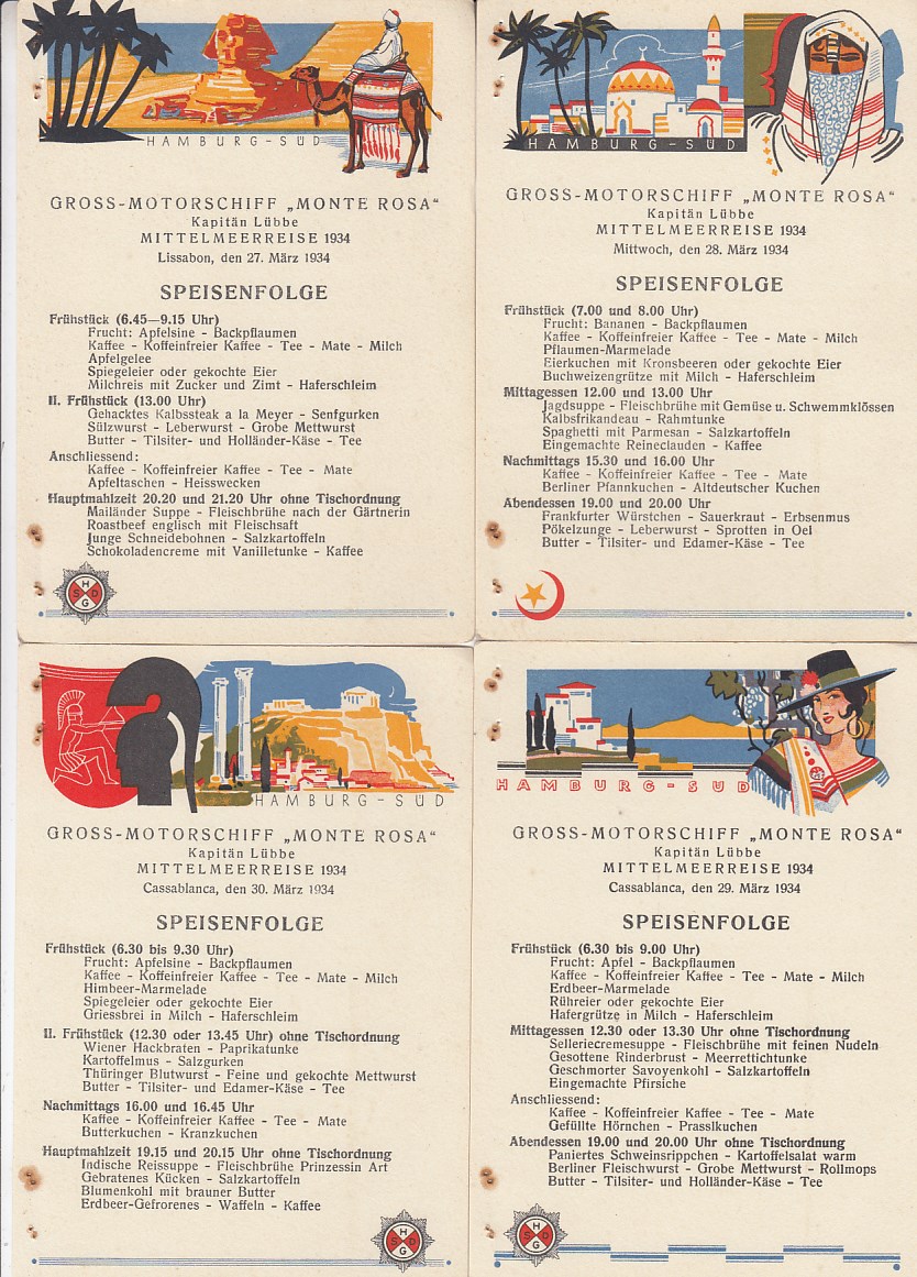 Menükarte Speisekarte 18x Ozeandampfer Monte Rosa Mittelmeerreise Kapitän Lübbe 1934