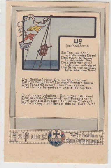 Liedkarten Musik vor 1945 Patriotisch 1.WK Wohlfarts-Karte U-Boote U9