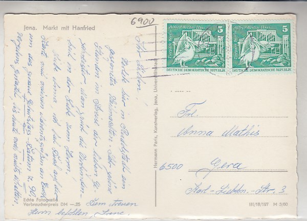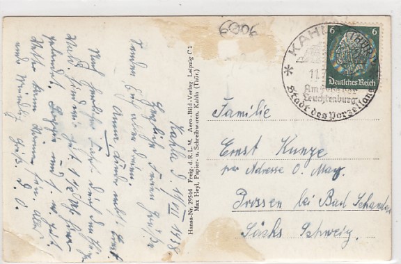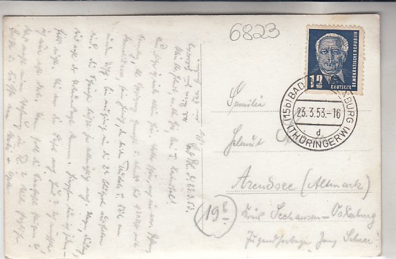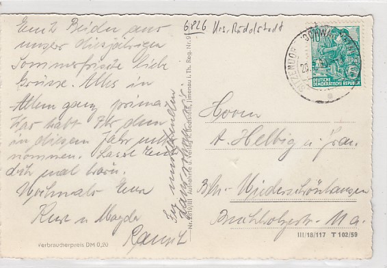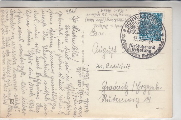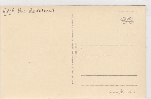 Schwarzburg in Thüringen Weißer Hirsch Bahnpoststempel Erfurt-Sonneberg 1959