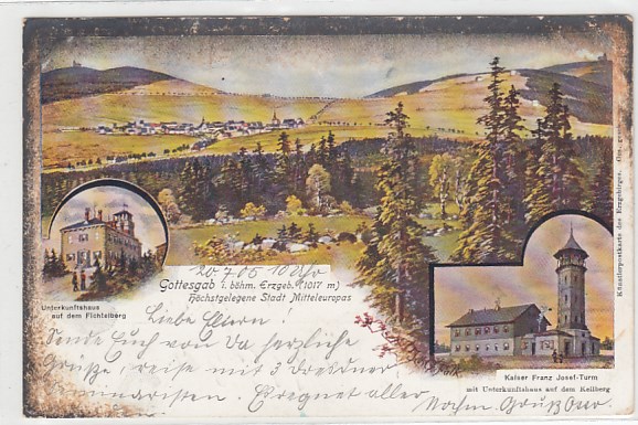 Gottesgab Böhmen Bozi Dar Erzgebirge mit Fichtelberg und Keilberg Tschechien Litho 1905