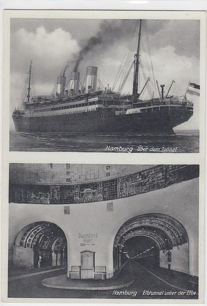Ozeandampfer in Hamburg mit Elbtunnel ca 1935