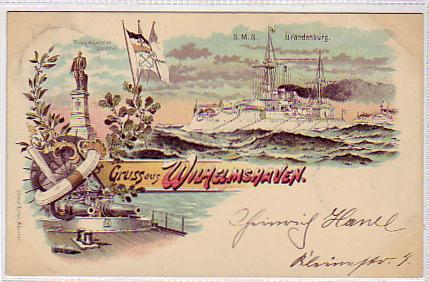 82122 [2940w122] |  | Wilhelmshaven S.M.S.Brandeburg Marine Kriegsschiff Litho 1899 | 16.00EUR | In den Warenkorb |