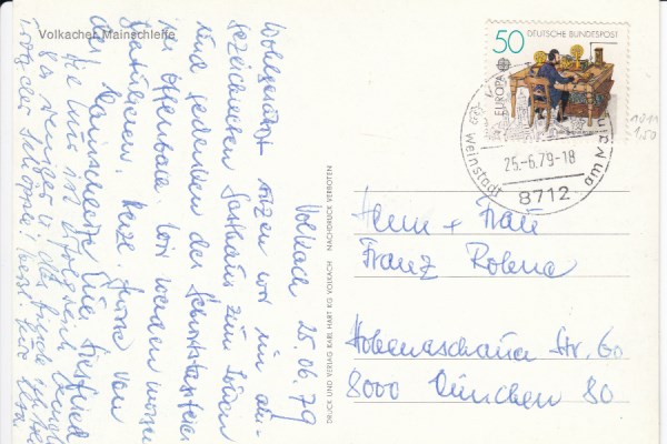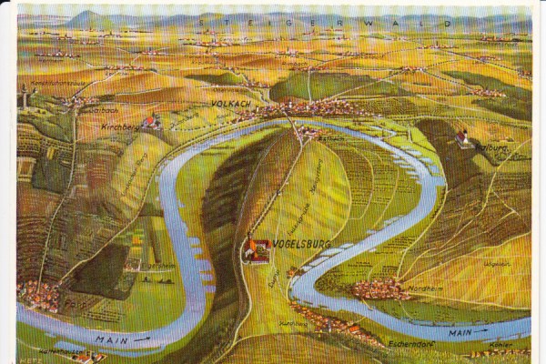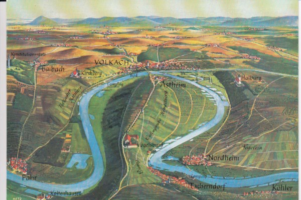 Postkarte als Landkarte Main Volkach Vogelsburg Kirchberg Halburg Nordheim Elgersheim Astheim
