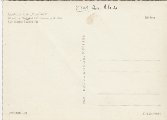 Löbsal am Golkwald bei Diesbar-Seußlitz an der Elbe Gasthaus zum Jägerheim 1964