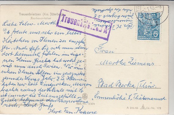 Treuenbrietzen Krankenhaus 1956 mit Landpoststempel