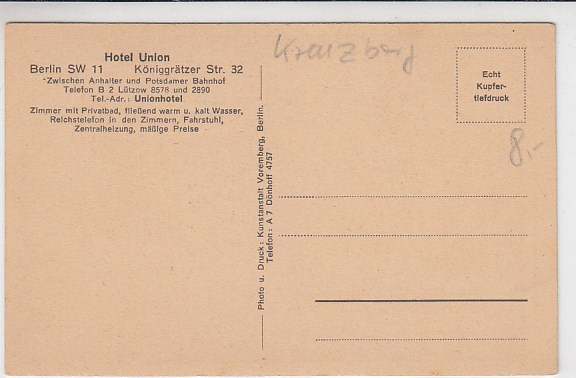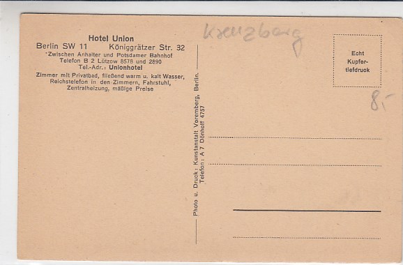 Berlin Kreuzberg Hotel Unsion Königgrätzer Straße ca 1930