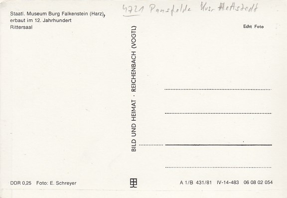 Burg Falkenstein Harz in Sachsen-Anhalt Rittersaal 1957