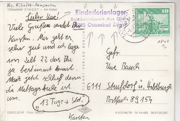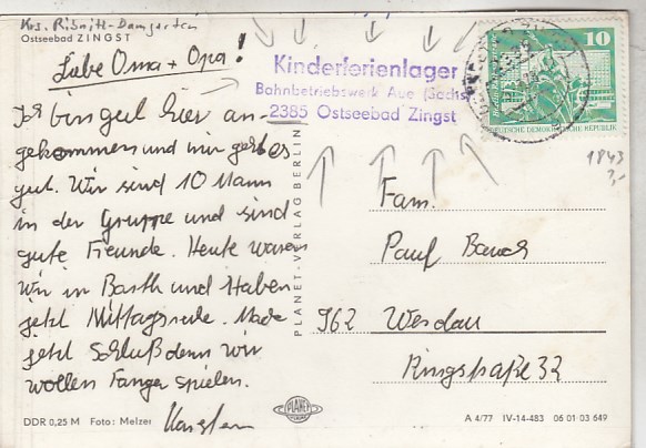 Ostseebad Zingst auf dem Darß Darss Sonderstempel Kinderferienlager Aue in Sachsen 1978