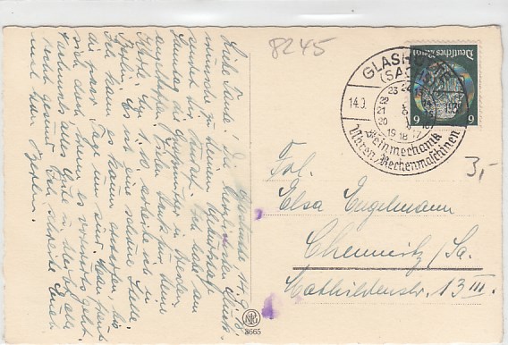 Glashütte in Sachsen Sonderstempel Feinmechanik Uhren Rechenmaschinen 1938