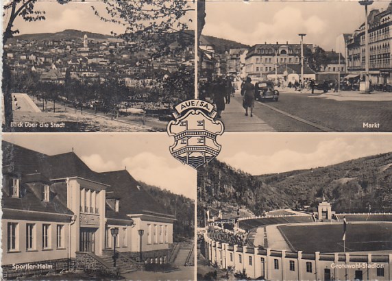 Aue im Erzgebirge in Sachsen mit Stadion und Sportlerheim 1961