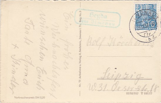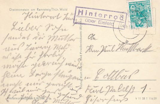 Landpoststempel Hinterrod AK Dreistromstein am Rennsteig 1959