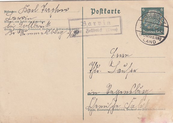 Landpoststempel Barvin bei Zollbrück Pommern