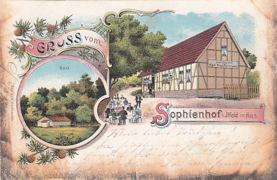 Sophienhof bei Ilfeld Südharz Litho Bahnpoststempel Nordhausen-Wernigerode 1900