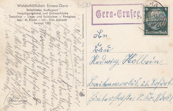 Gera Waldschlößchen Ernsee mit Landpoststempel 1940
