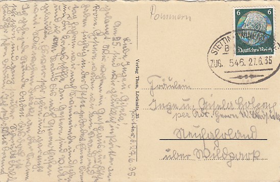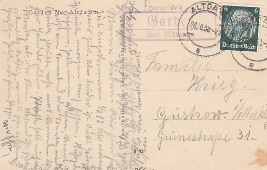 Garden über Altdamm Pommern mit Landpoststempel 1938