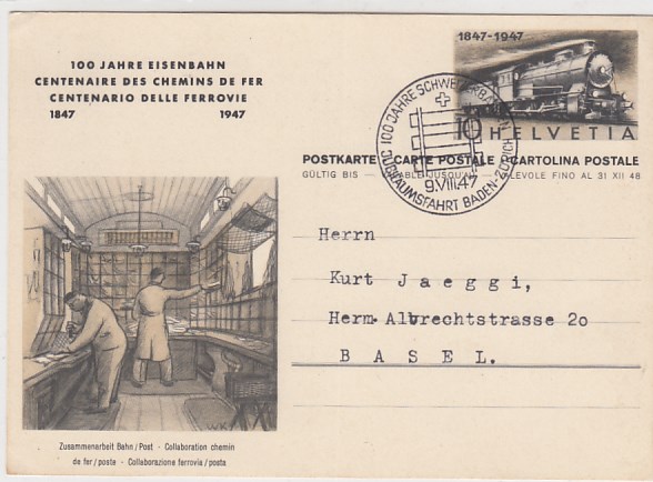Postkarte Anlaß Stempel Sonderstempel 100 Jahre Eisenbahn Baden-Zürich Bahnpoststempel Schweiz