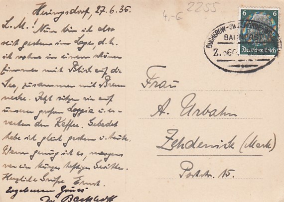 Ostseebad Heringsdorf Bahnpoststempel Ducherow 1935