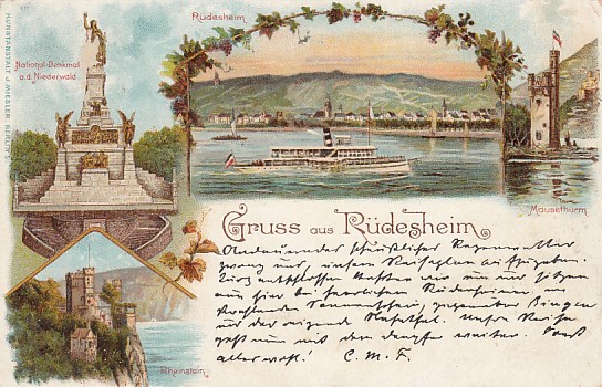 Rüdesheim am Rhein Litho Ansichtskarte mit Bahnpoststempel 1898