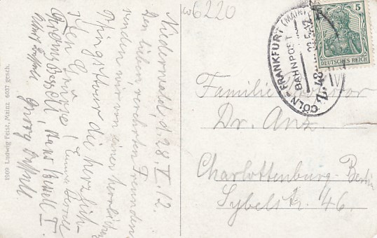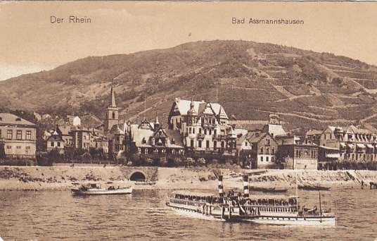 Bad Assmannshausen Rhein Raddampfer Bahnpoststempel Köln-Frankfurt 1912