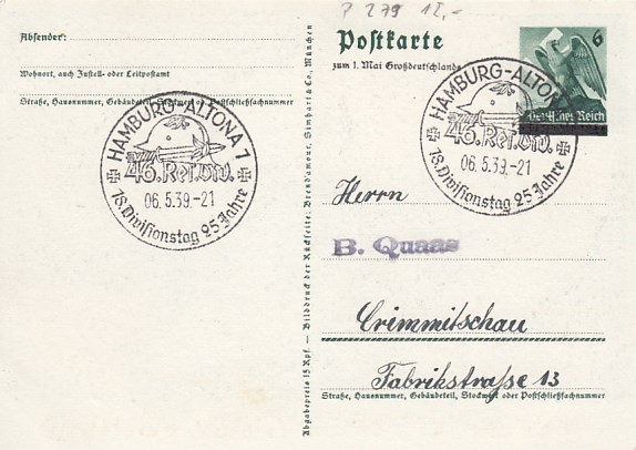 Privatganzsache Der Führer Sonderstempel Hamburg Altona 1939 46. Reserve Division