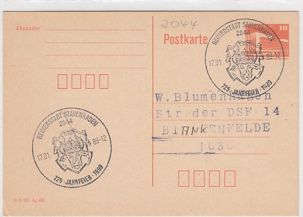 Stavenhagen Postkarte mit Sonderstempel 1989