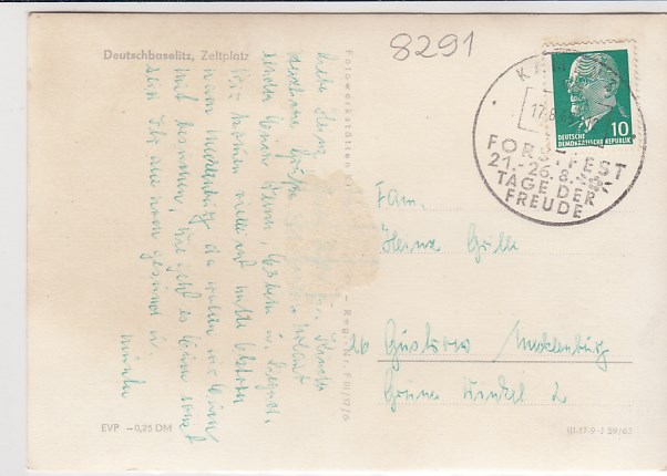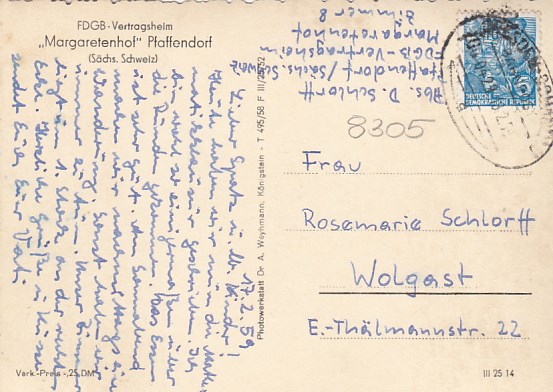 Margaretenhof Pfaffendorf Bahnpoststempel 1959